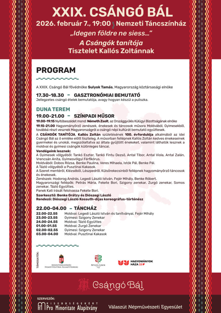 A Kisebbségekért – Pro Minoritate Alapítvány és a Válaszút Népművészeti Egyesület huszonkilencedik alkalommal szervezi meg 2026. február 7-én a Csángó Bált, a budapesti Nemzeti Táncszínházban.